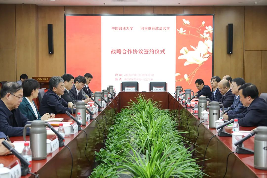 10月13日,河南财经政法大学与中国政法大学签署战略合作协议。中国政法大学校长马怀德、副校长冯世勇、党委副书记黄瑞宇,河南财经政法大学党委书记、校长司林胜,副校长刘荣增、陈晓景、赵楠出席签约仪式。