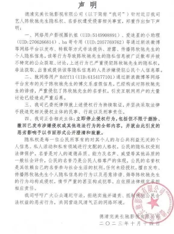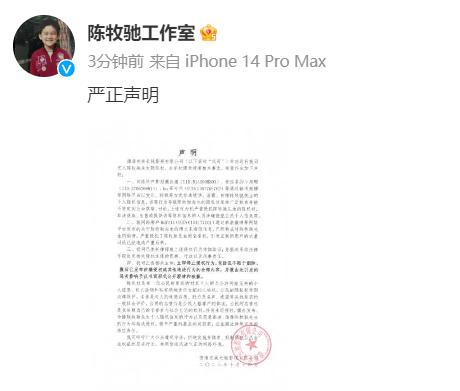 10月14日,@陈牧驰工作室 发布声明,针对近日@陈牧驰Chen 个人隐私泄露一事,表示已经委托律师就侵权行为持续取证,并坚决采取法律手段追究相关侵权主体的民事、行政以及刑事责任。