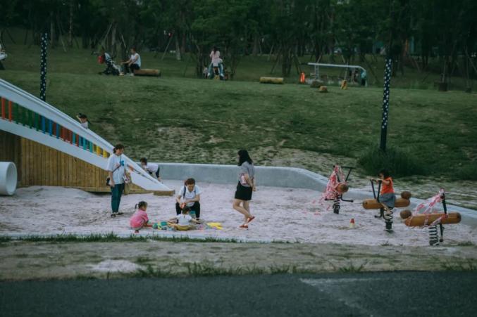 旁边的儿童游乐场里沙坑、木马、滑滑梯