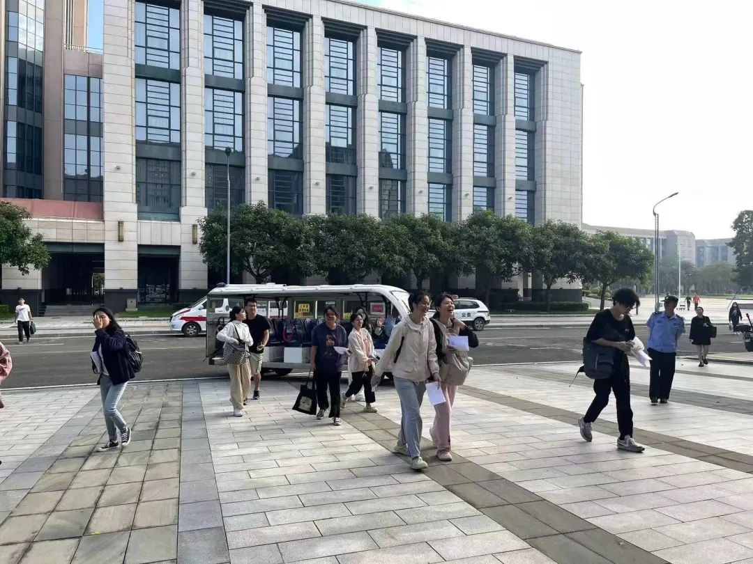 接驳车将考生送至考场↑