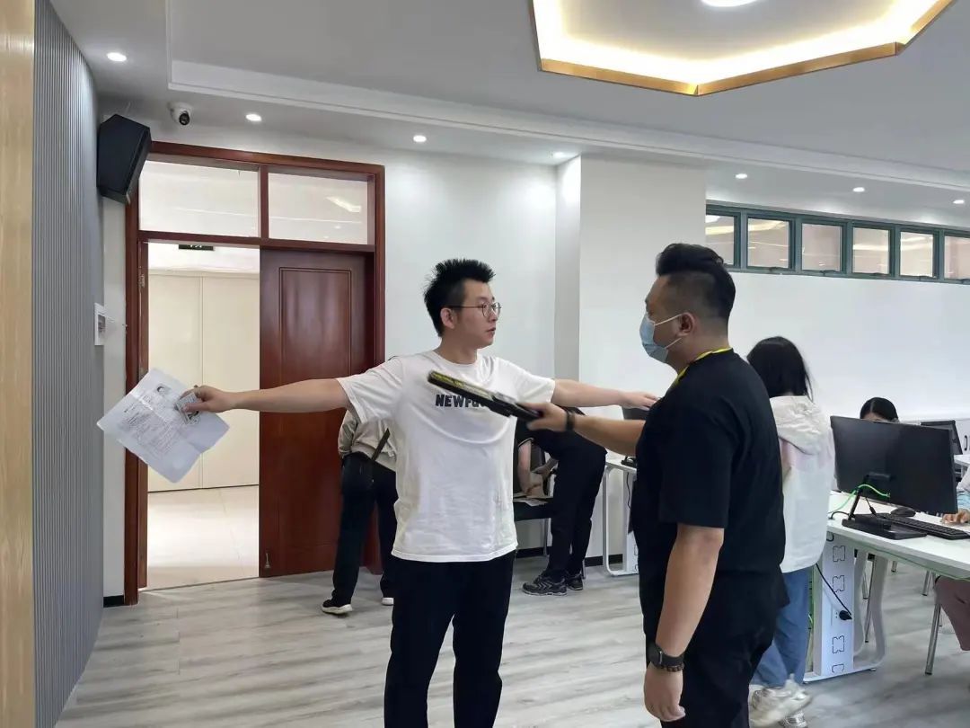 考务人员手持金属探测仪检查入场考生↑