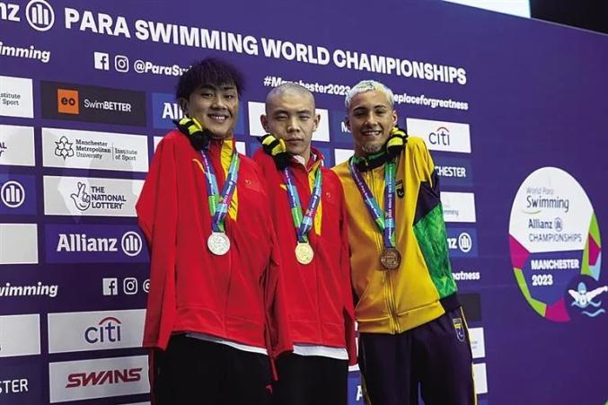 郭金城(中)今年23岁的郭金城是亚残运会上的新面孔,也是泳坛一颗冉冉升起的新星。