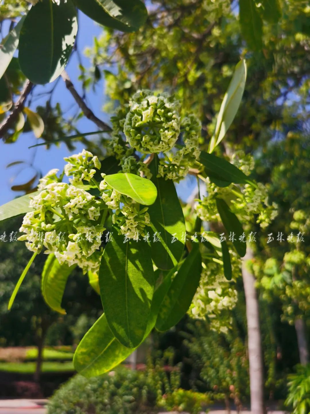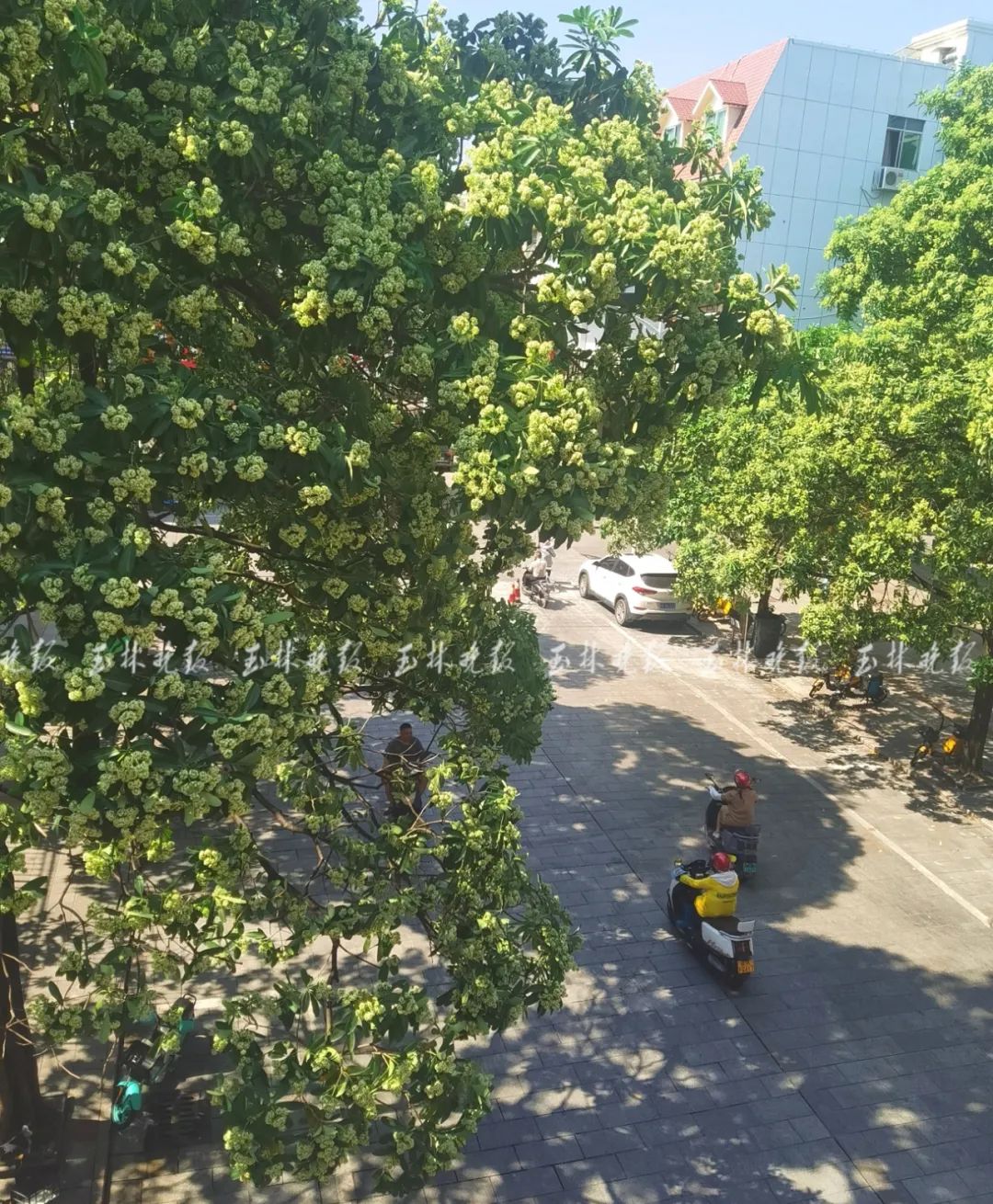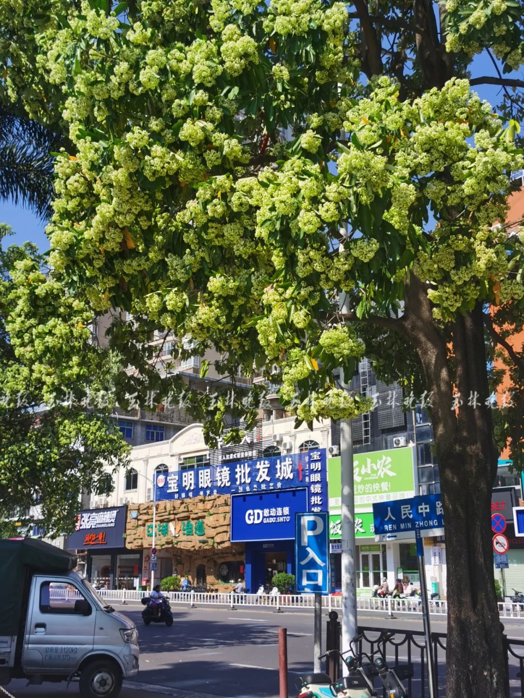 人民中路的盆架子树开花盆架子树花白色,多朵组成稠密的聚伞花序,花期6月至11月,由于不同人对花香的敏感程度不同,导致有人觉得此味道刺鼻难闻、有人觉得清香怡人,目前暂无研究数据证明盆架子树的花香气味有毒。盆架子花香最浓烈的时间持续10天左右,因此市民不必过于担忧。