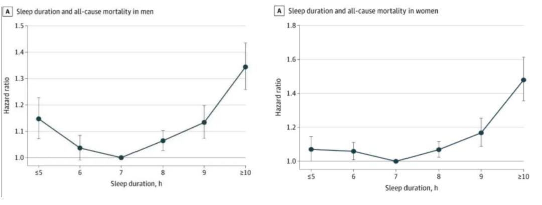 男性(图左)、女性(图右)睡眠时长与全因死亡率的关系可以说,大数据统计到7小时是一个“最佳睡眠时长”。当然具体时间还要因人而异,只要你睡醒后感觉精神饱满、身体舒服即可。