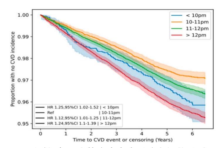 入睡时间与心血管疾病发生风险之间的关系具体来看,与10:00至10:59入睡相比,晚上11:00-11:59入睡的人患心血管疾病的风险高12%,在午夜或更晚入睡的人高25%,而晚上10:00之前入睡的人高24%。