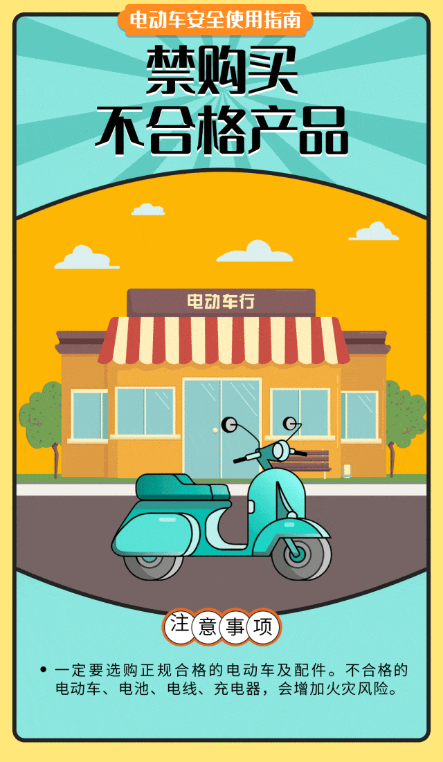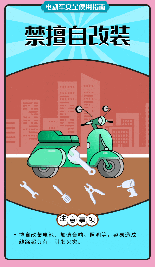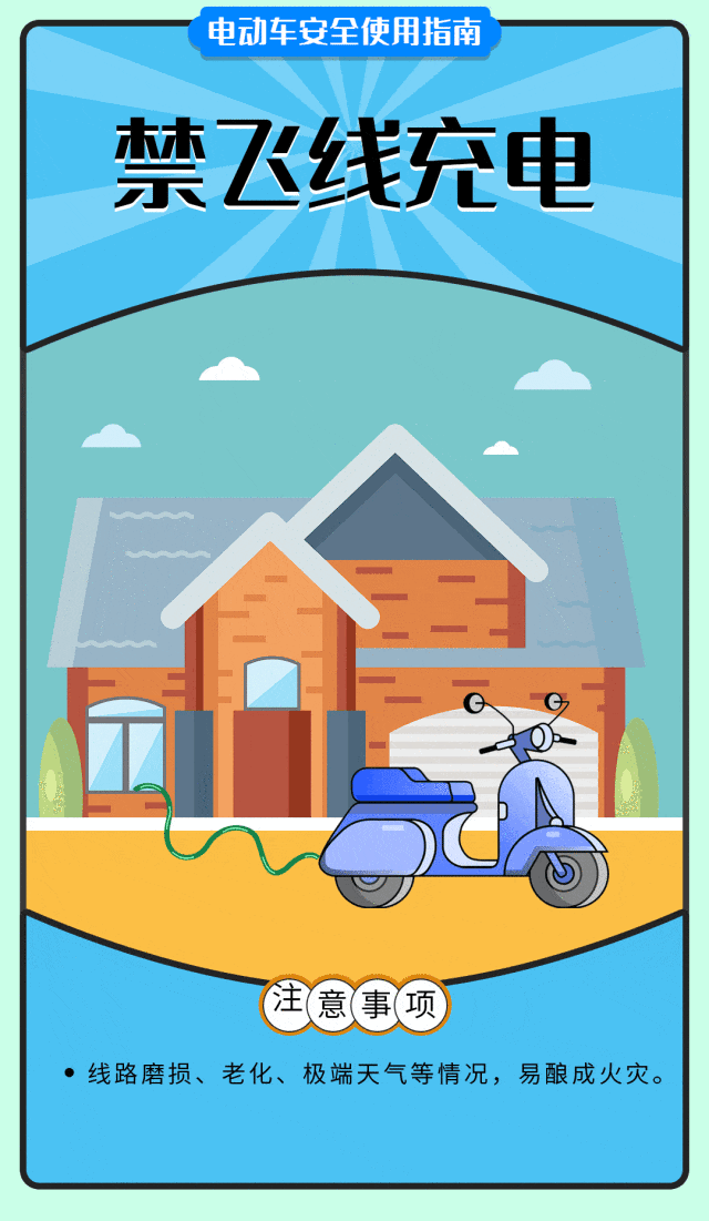 为了您和他人的生命安全,请勿心存侥幸。电动自行车及电池禁止进楼入户停放、充电,禁止飞线充电,不盲目改装,加强日常自查自检,最后请收好下面这份安全使用指南。
