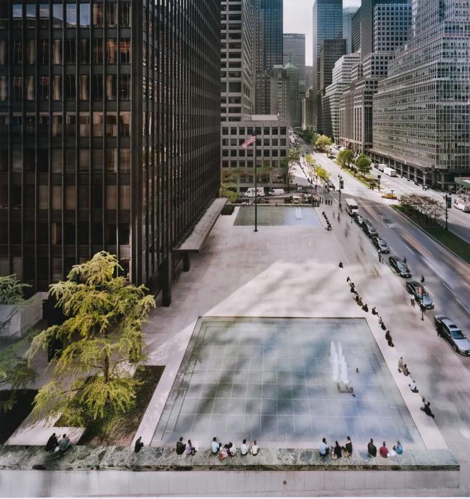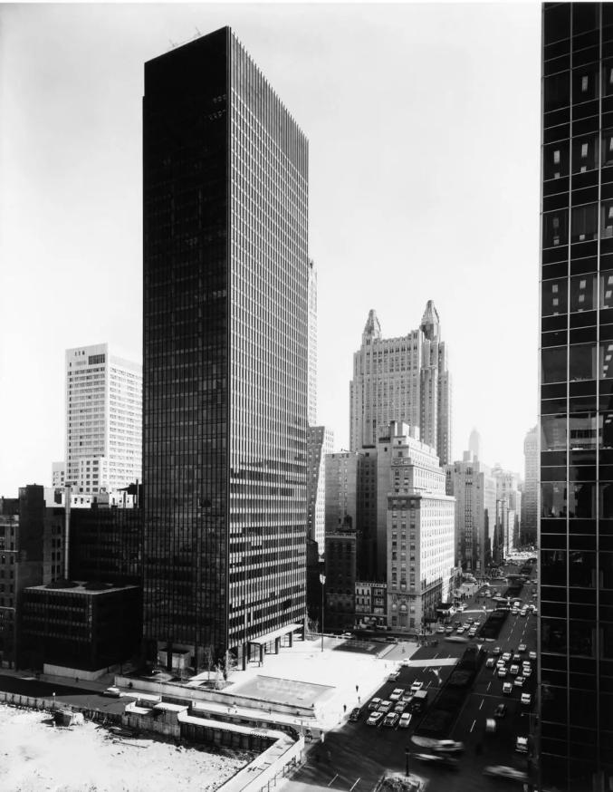 密斯用一栋国际主义风格的摩天大楼完成了他在纽约的首秀,而这栋建筑也永久改变了此类型建筑的发展轨迹。坐落在曼哈顿中心公园大道上的是一家大型公司的总部,建筑通过全黑的工字钢传递出力量感,还提供了一个宝贵且日后备受人们喜爱的公共喷泉广场。和由SOM设计的浅色调利华大厦一起,为纽约以及整个建筑界竖立起了玻璃大楼的标杆。