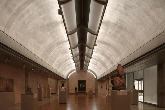 © Nic Lehoux金贝尔美术馆使用了一列连续的混凝土结构拱顶,其中的一拱作为了衔接公园和美术馆的凉廊。这个结构在建筑上的目的在于解决如何才能让自然光轻柔地洒进装满脆弱展品的博物馆里的问题。通过创新性的屋顶天窗,太阳光会被反射到拱腹的位置,然后再漫射到展厅的墙上。