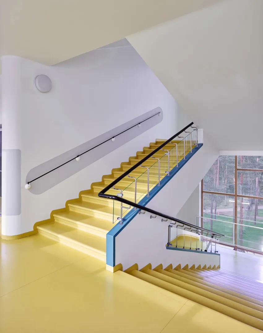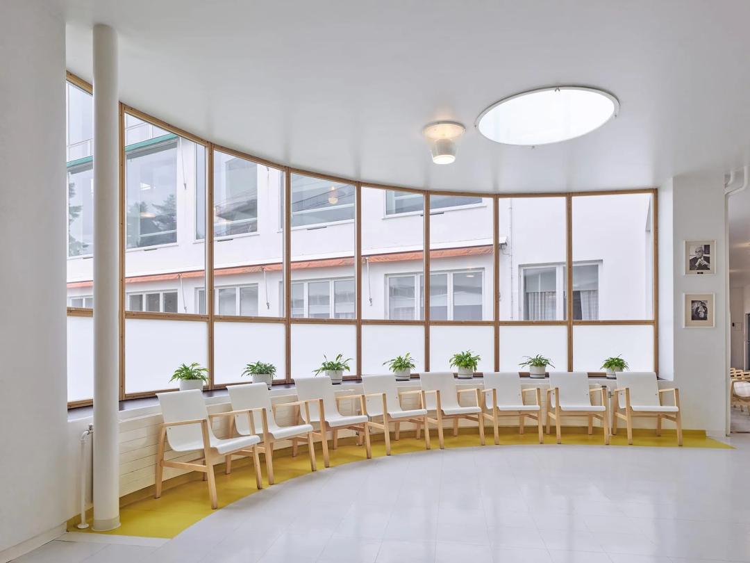 © Fabrice Fouillet那时的医生认为阳光和空气是对这类疾病而言最好的治疗手段,所以阿尔托夫妇在设计的时候考虑到了治疗的用途,因而倾斜的房屋和露台都朝向南方过来的阳光。两端相对突出的住院楼在外部看来只是一个处于清晰线型上的简单几何体,但它的内部远远要复杂许多。相互连通的房间和弧形的室内设计都标志着一种全新的设计风格。