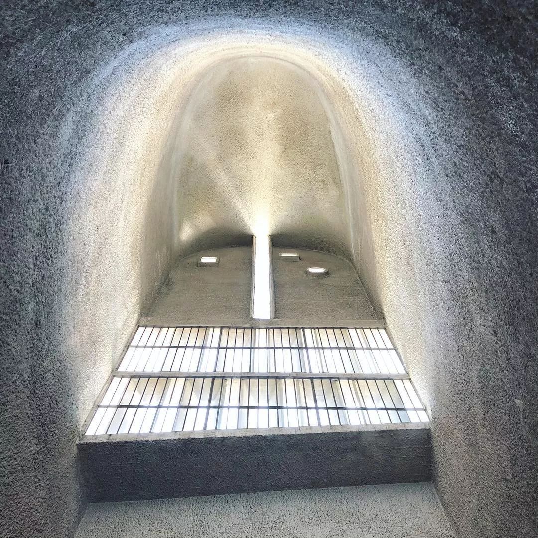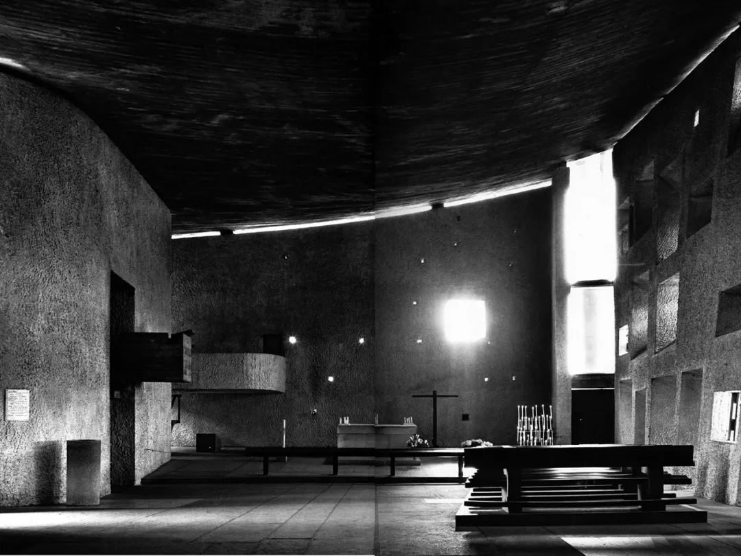 “我满怀期待穿越礼拜堂大门,却被眼前背叛了我的想象的、堪称暴力的激烈空间完全震慑住,好一阵子都说不出话来。排除了所有水平、垂直的线条,毫不掩饰灰泥墙饰质感的粗犷雕塑;满溢在不规则平面形状内部空间、如洪水般的光。朗香教堂的一切,都颠覆了当时我对建筑的常识。”——安藤忠雄