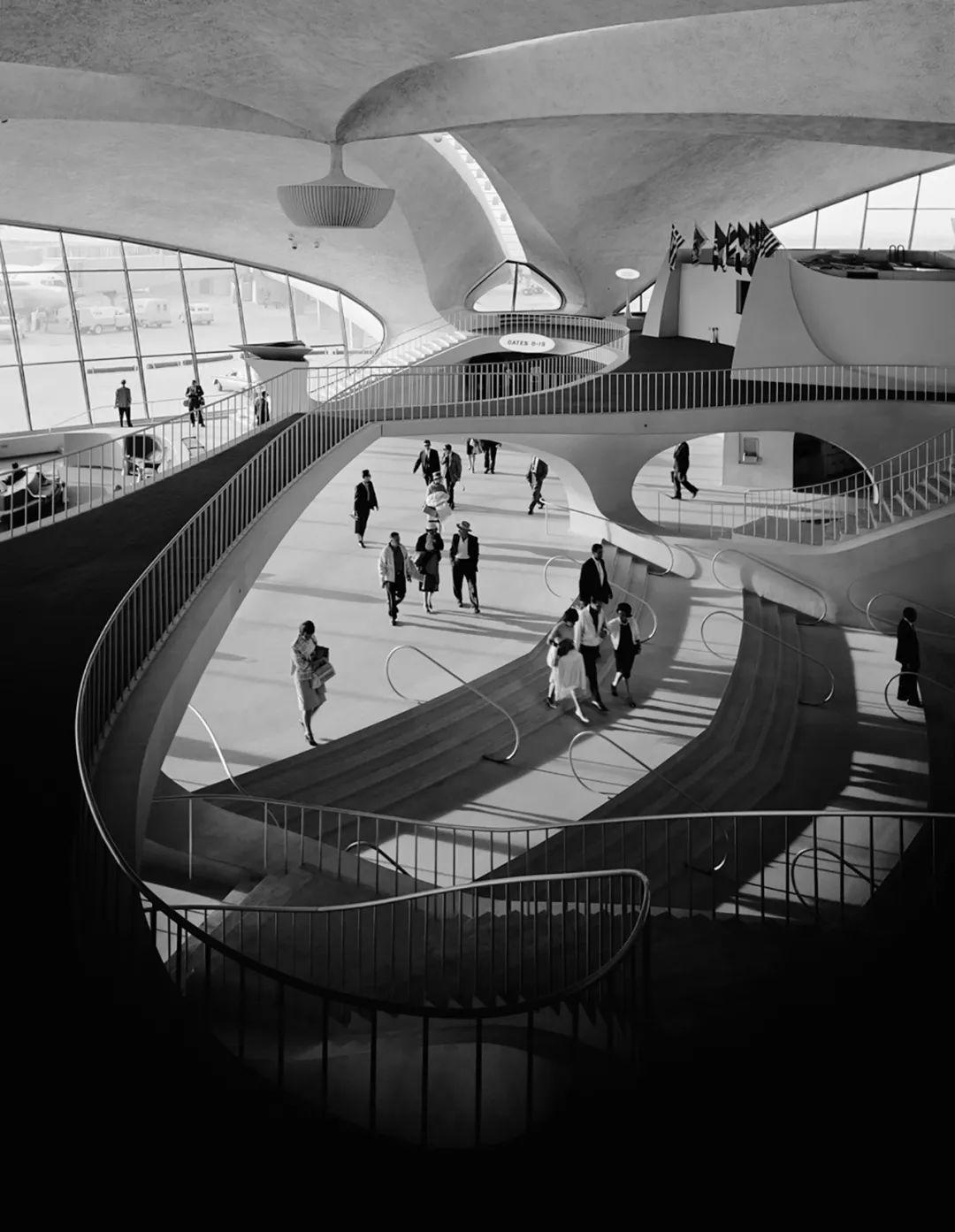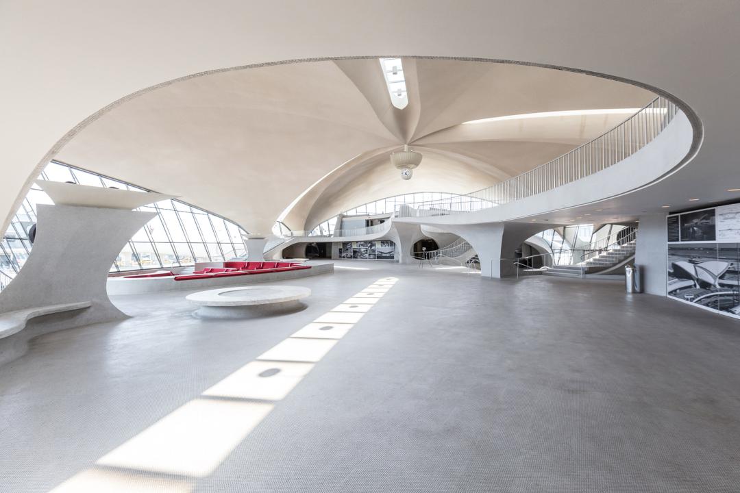 候机楼内建有下沉式休息室,并拥有世界上第一条行李传送带。四根Y型柱支撑起薄壳型的屋顶,柱子之间开了天窗。富有表现力的设计传达了即将启程的激动心情,这座前环球航空公司(Trans World Airlines)航站楼在1962年建成时就近乎超负荷运作。建成后,乘客们可以在起飞前享用一顿美食,也可以在两层楼高的弯弯曲曲的内部和令人印象深刻的长步行桥上闲逛,或是看看机场翻牌显示器上的起落信息。2019年,这个航站楼被翻修成了新机场酒店的公共大厅。