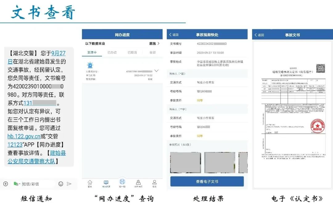 三、值班民警根据接警人员收集的事故现场信息及时完成事故定责后,当事人即可收到短信通知,随后可在“交管12123” APP的【网办进度】模块中查看事故处理结果,查看并下载电子版《道路交通事故认定书》用于保险理赔。