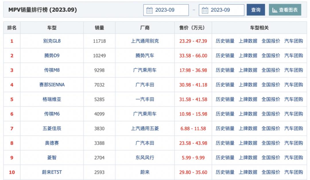在行业人士看来,大概率这是因为当前燃油动力MPV车型仍占霸主地位。车主之家统计数据显示,过去的9月里,国内MPV销量前10名的别克GL8、腾势D9,传祺M8,赛那SIENNA、格瑞维亚等车型,基本上均为燃油或混合动力驱动。