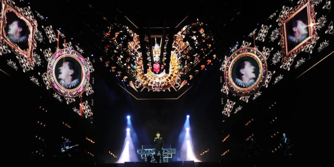 本次演唱会舞台采用独特的“V”字结构,配有大型的视频墙和投影幕布,通过高清的影像、艺术特效和动画等视觉元素,为观众呈现出一个色彩斑斓且富有创意的舞台背景。