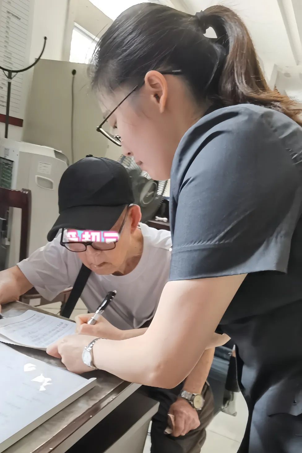 万大爷听力不好,干警和他写字交流。