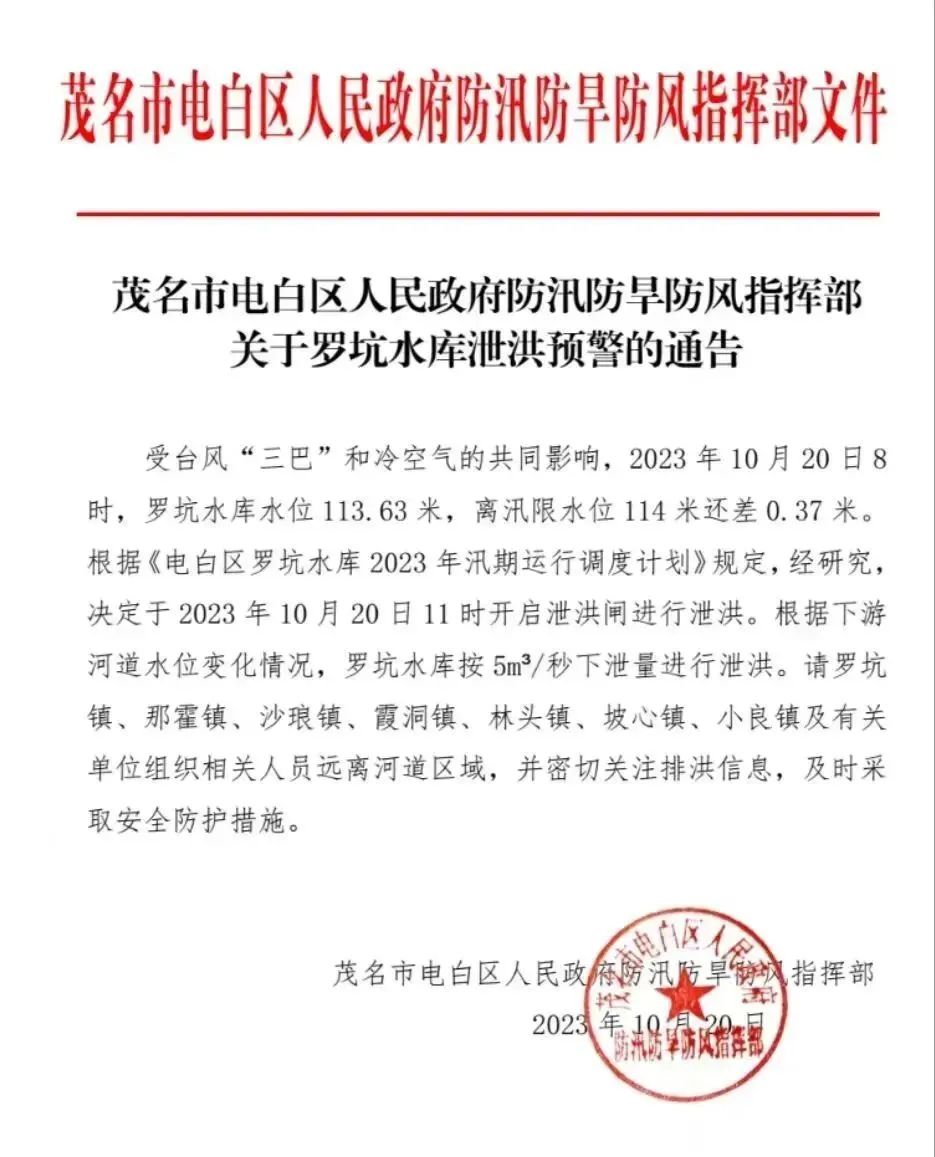 由于受台风“三巴”的影响,高州水库水位已超汛限水位,根据《高州水库防洪应急预案》规定,经研究,决定于10月20日12时在石骨溢洪道和良德溢洪道同时开始排洪,根据水雨情,石骨溢洪道排洪流量为20-400立方米/秒,良德溢洪道排洪流量为20-200立方米/秒。请高州市政府、化州市政府、吴川市政府组织相关人员远离河道区域,并密切关注排洪信息,及时采取安全防护措施。