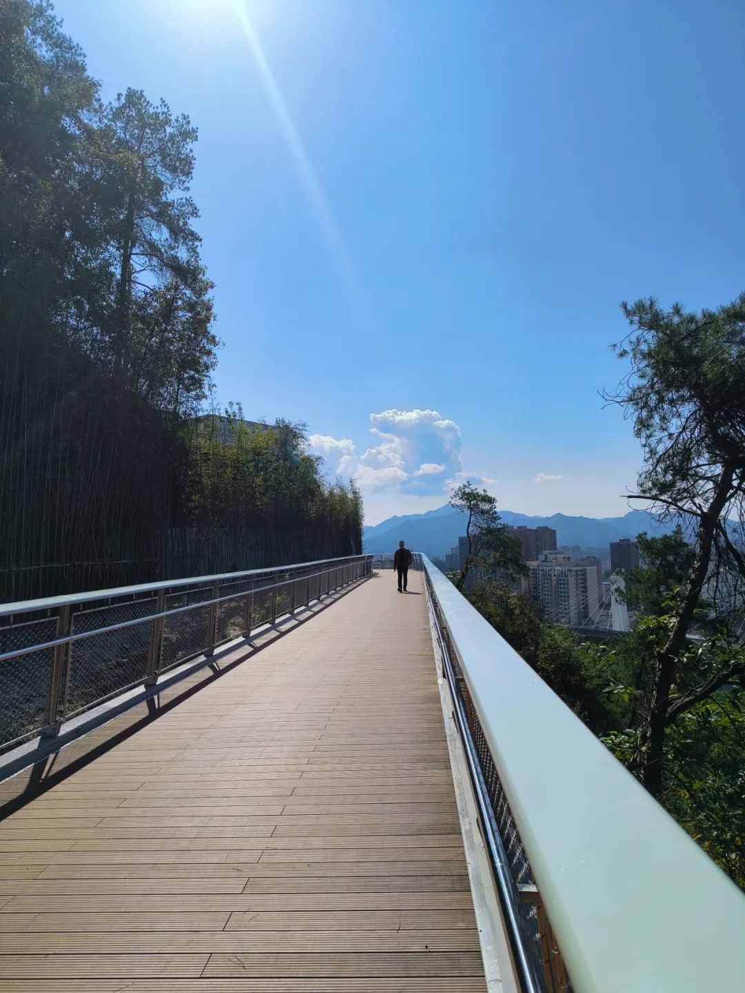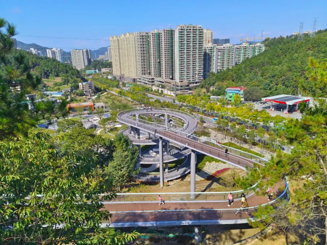 为减少景观树运输过程对山体生态环境的破坏,我市林业部门创新采取无人机“空投”树木的方式,对健康步道周边山体进行林相季相改造,确保呈现“春花浪漫、夏花热烈、秋叶浸染、冬叶飘飞”的景观效果;在修建观景平台时,一棵胸径约10厘米、高5米的松树给地板铺装带来“麻烦”,但施工人员没舍得砍树。如今,这棵松树依旧傲然地耸立在宽阔干净的观景台中央;