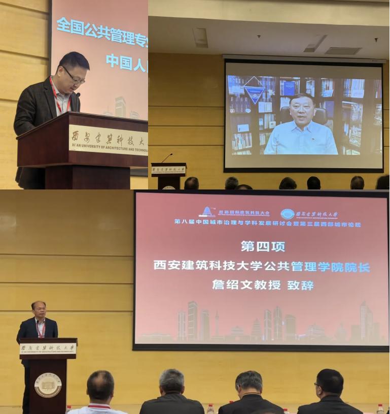 接下来分别由全国公共管理专业学位研究教育指导委员会秘书长、中国人民大学公共管理学院院长严金明教授(秦波教授代为宣读)、城市规划学会副理事长石楠教授、西安建筑公共管理学院院长詹绍文致辞。致辞嘉宾一致城市治理与学科发展的研讨会将会大力促进国内城市管理领域学者们的思想交流和学术研讨,推动国家加强城市建设、发挥城市治理效能。