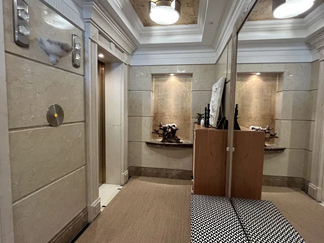 一整层住的只有一户,真正意义上的独门独户,从踏出电梯的那一刻起,就进入了自家领域电梯厅的这一块区域,都是业主一家人使用,而且出入家门也很隐私