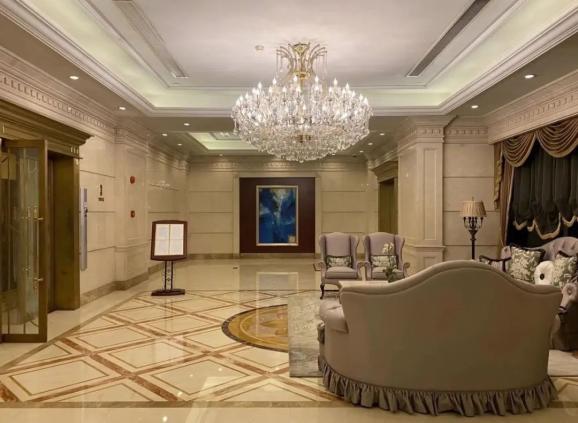 从大堂再到电梯厅,装饰着一个个富丽堂皇的超大水晶灯,仿佛走进了一间宫殿