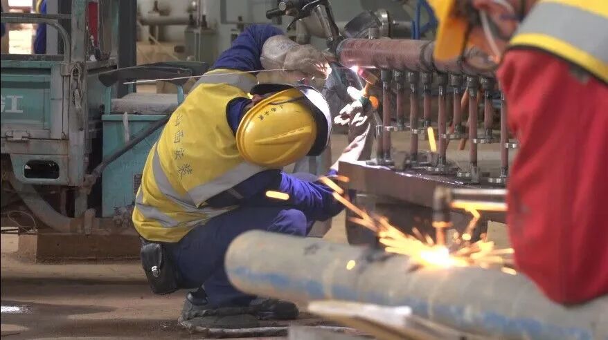 现场塔吊林立、机器轰鸣、焊花四溅