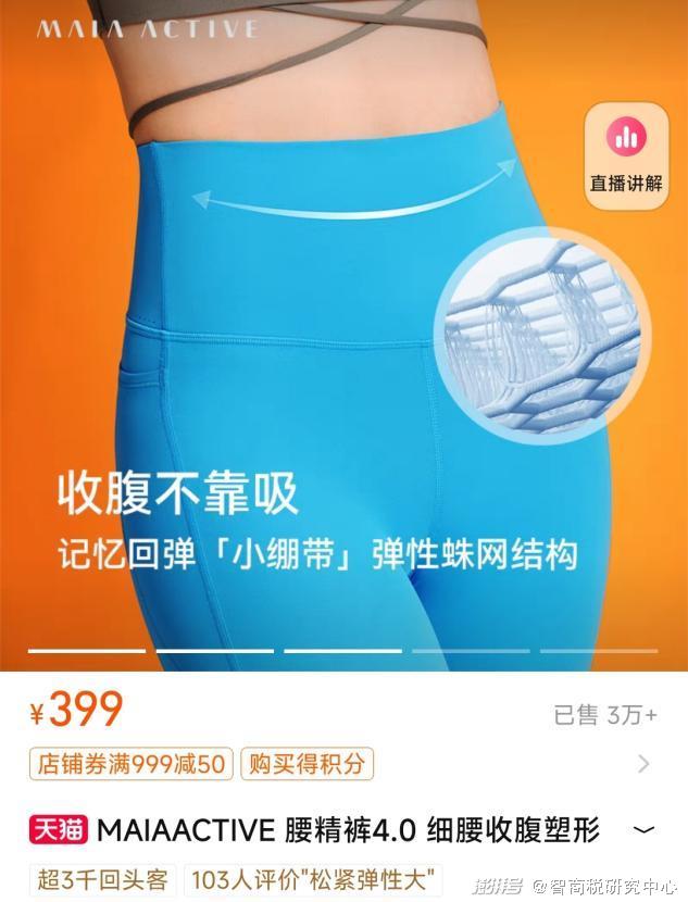 比如,最近被安踏收购的MAIA ACTIVE,就推出了腰精裤产品,宣传可以细腰收腹塑形提臀,在天猫旗舰店售价399元,销量已超过3万。