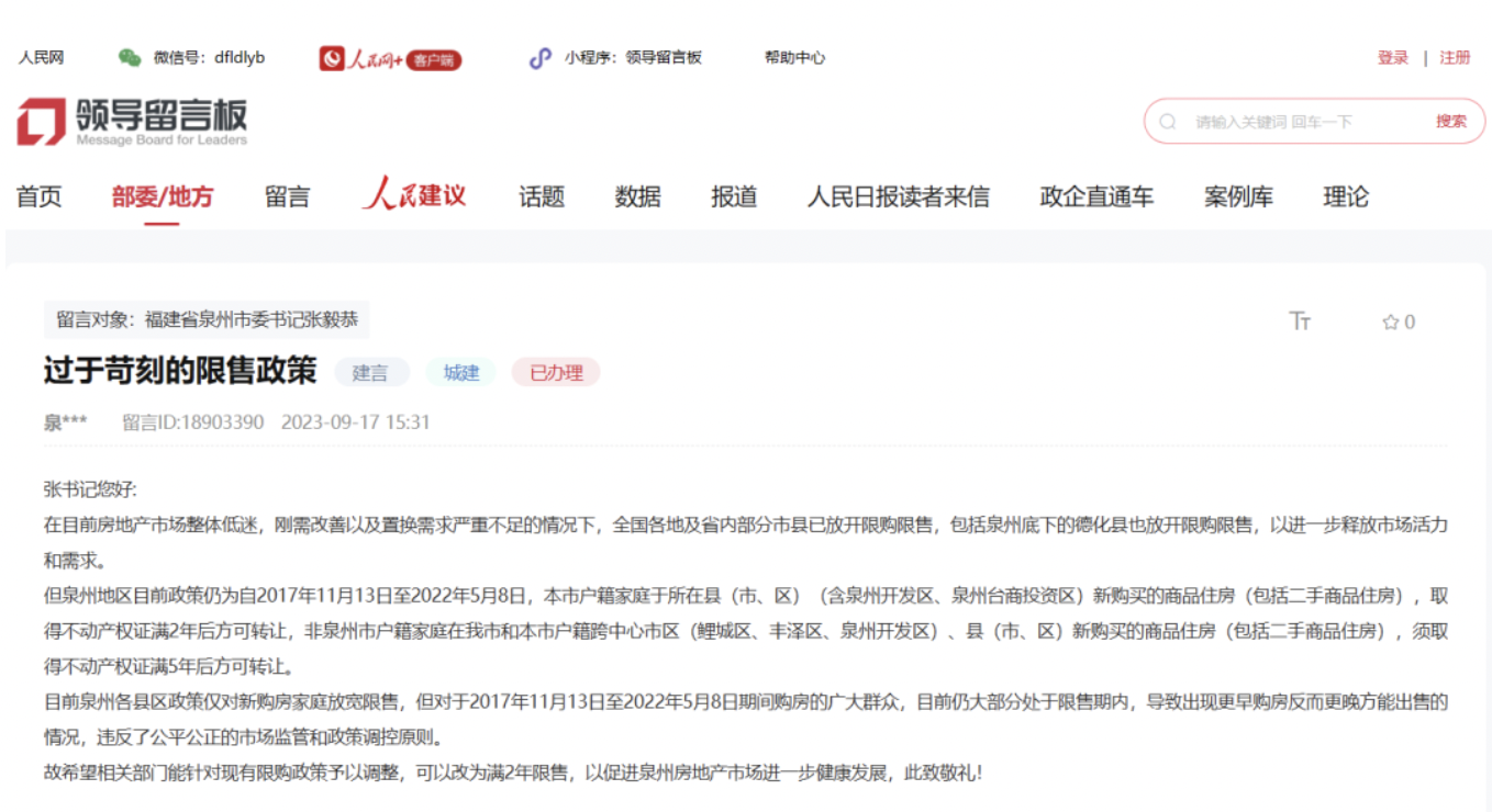 今年6月至今,部分群众陆续通过人民网“领导留言板”建议福建省泉州市因时因势调整限售相关政策,以减少对老百姓生活的影响。