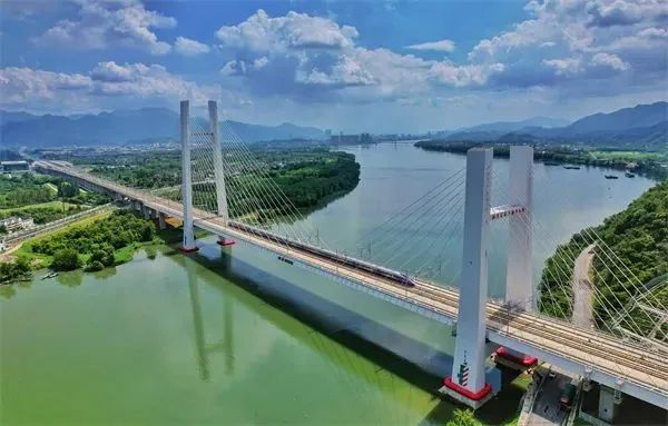 △亚运列车驶过富春江特大桥从冬奥会到亚运会,依托渐变式喷涂经验,这次团队又有了新巧思。“在亚运列车的喷绘油漆中增加珠光粉,能够使‘虹韵紫’呈现出金属的效果。”贾兴泷介绍,色彩调配只是亚运列车科技感体现的一种形式,团队成员并不满足于此,他们期望探索新的表达,想为“她”注入更多人文理念。