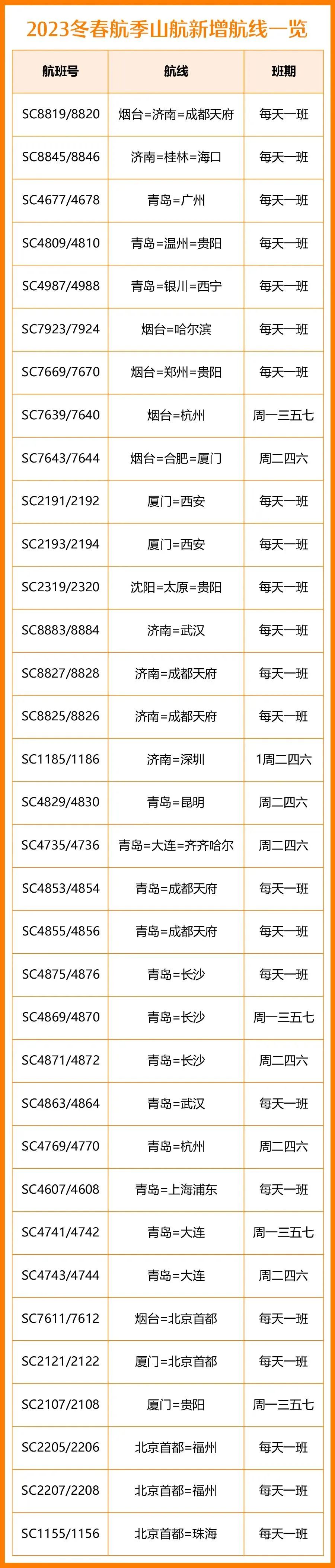 为满足旅客出行需求,山航计划新开烟台一济南一成都天府、济南一桂林一海口、青岛一温州一贵阳、烟台一合肥一厦门、沈阳一太原一贵阳在内的34条热门航线!