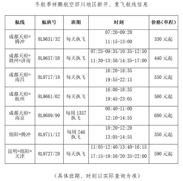 换季执行新航班计划后,祥鹏航空对在川运营的部分新航线推出优惠活动,不含税费的单程最低票价为330元。通过优惠的票价和优化的航线网络,为四川地区旅客出行提供更便捷、更丰富的出行选择。
