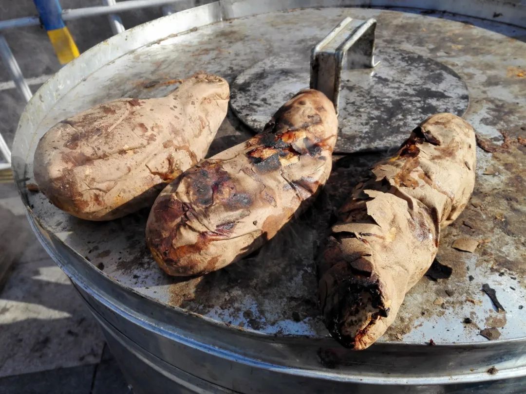 刚从铁桶中掏出的烤红薯,滚烫着接过来,扒开皱皱的外皮,一口咬下甜糯的果肉,最好吃的是外皮和果肉连接处略微焦香的那一层,贴着皮啃下来,有点嚼劲还爆甜。