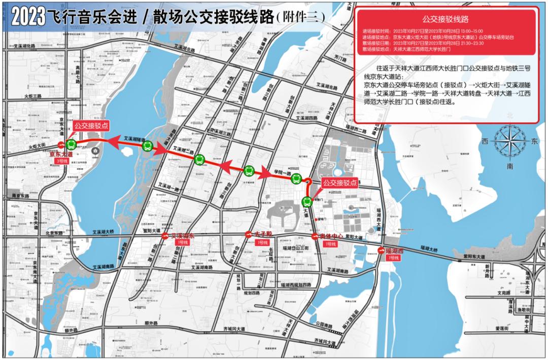 散场时,观众可步行至江西师范大学长胜门(公交接驳点)返回京东大道站换乘地铁3号线。