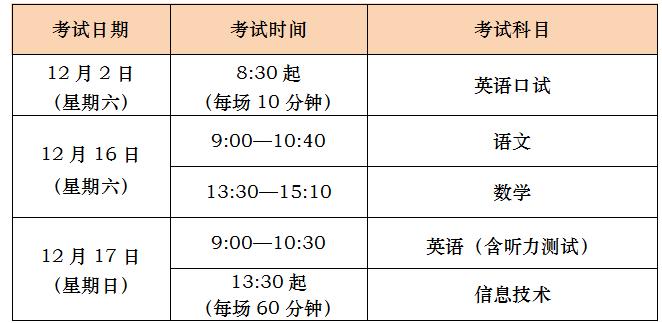 本市普通全日制中等职业学校在籍学生中,2022学年入学的二年级学生(不含中高职贯通、五年一贯制、中本贯通、外招和成人中专等学生),以及2022学年入学的新疆、西藏(含青海)内职班学生均须报名参加语文、数学、英语和信息技术4门科目考试,学生在休学期间不得报名。
