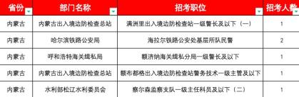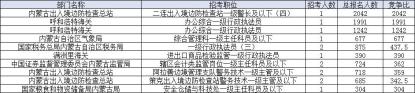 中国人民银行内蒙古自治区分行共计招录157人,总报名人数达6674人;其次是内蒙古出入境边防检查总站,共计招录40人,报名人数达3909人,值得注意的是该单位有5个岗位学历要求为专科及以上,共计招录10人,工作地点为阿拉善盟。