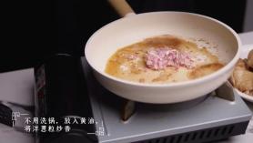 4.鸡肉煎完盛出来,不用洗锅;放入小块黄油,将洋葱和蒜的颗粒炒香。