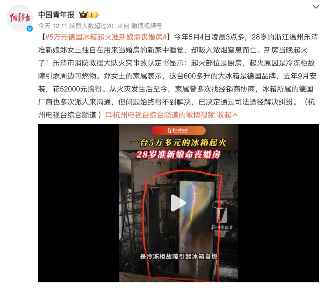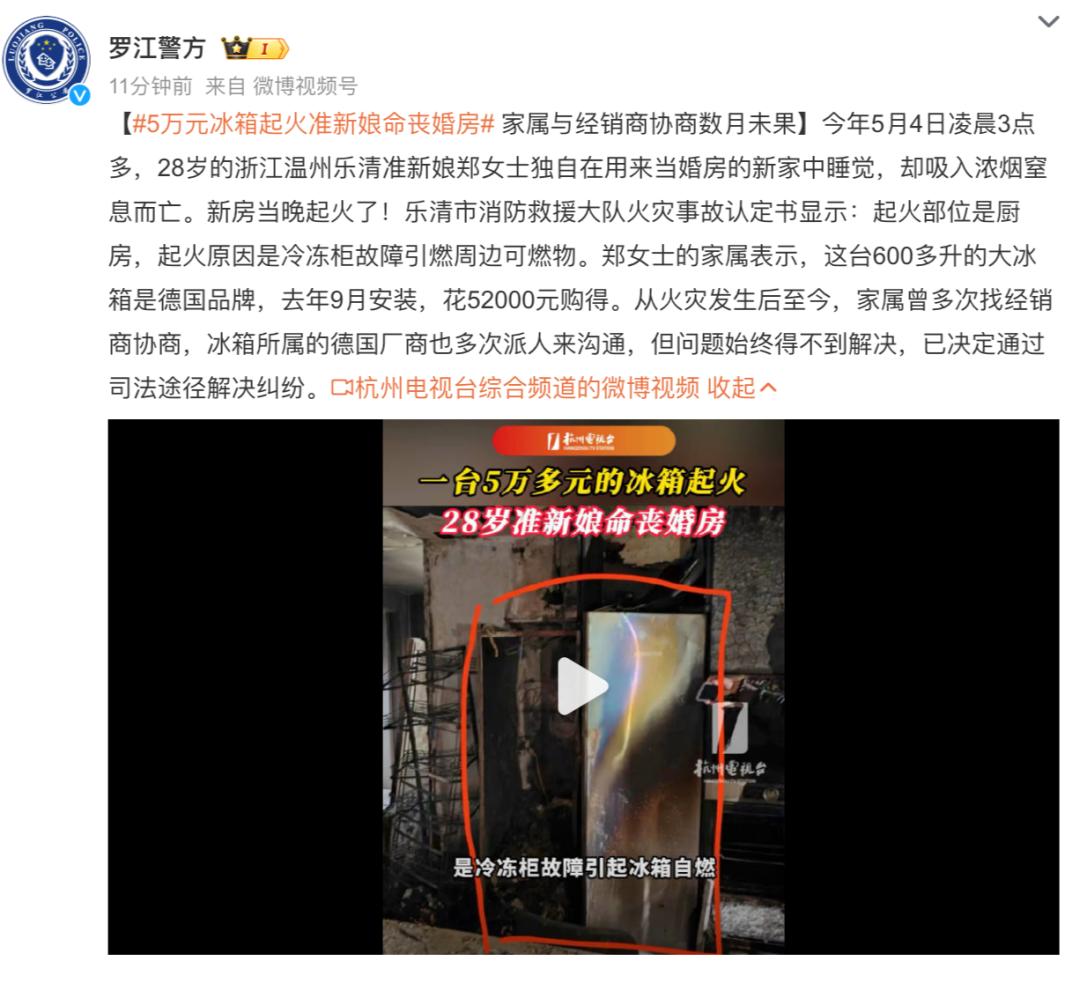 近日,一段令人心碎的视频在网络上流传:28岁的郑女士准新娘在婚房失火中身亡。原本以为是一场大火,但事实却令人震惊——引发悲剧的竟是一台价值5.2万元的冰箱!多家媒体纷纷进行报道。