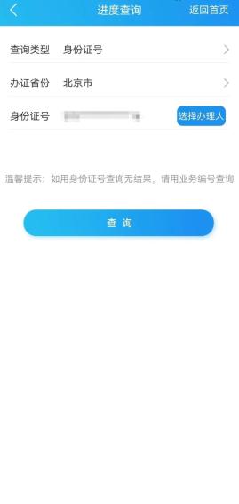 返回首页点击“办证进度查询”,选择办证省份,输入身份证号点击“查询”。(如用身份证号查询无结果,请用业务编号查询)
