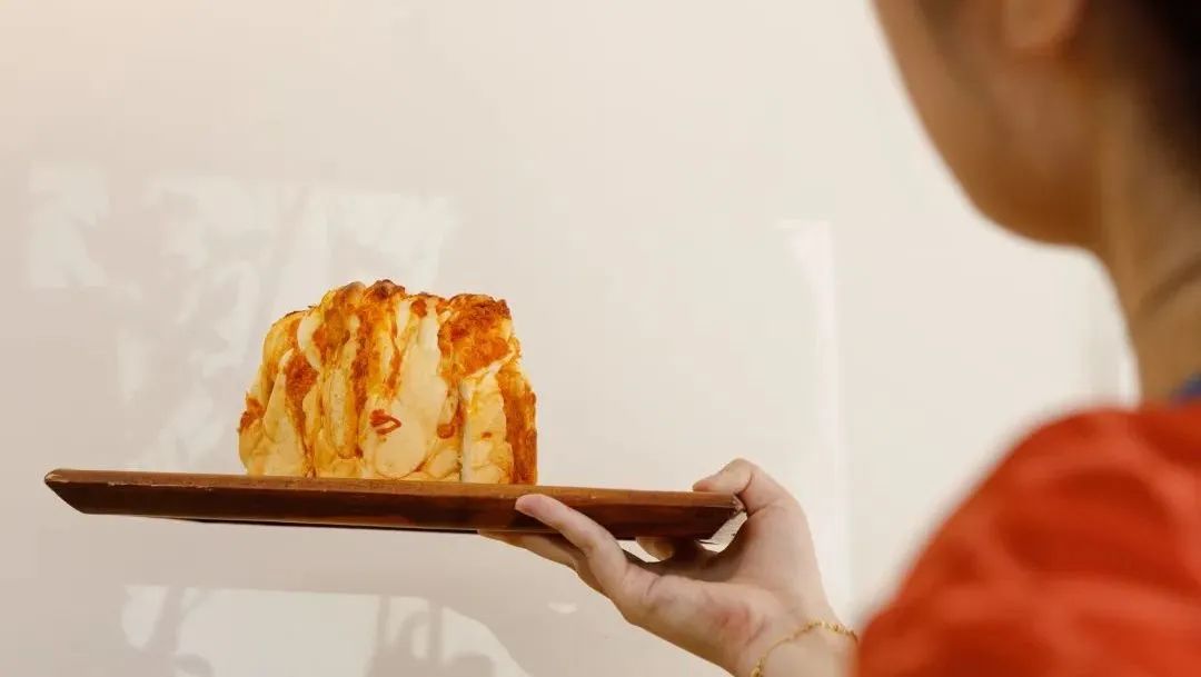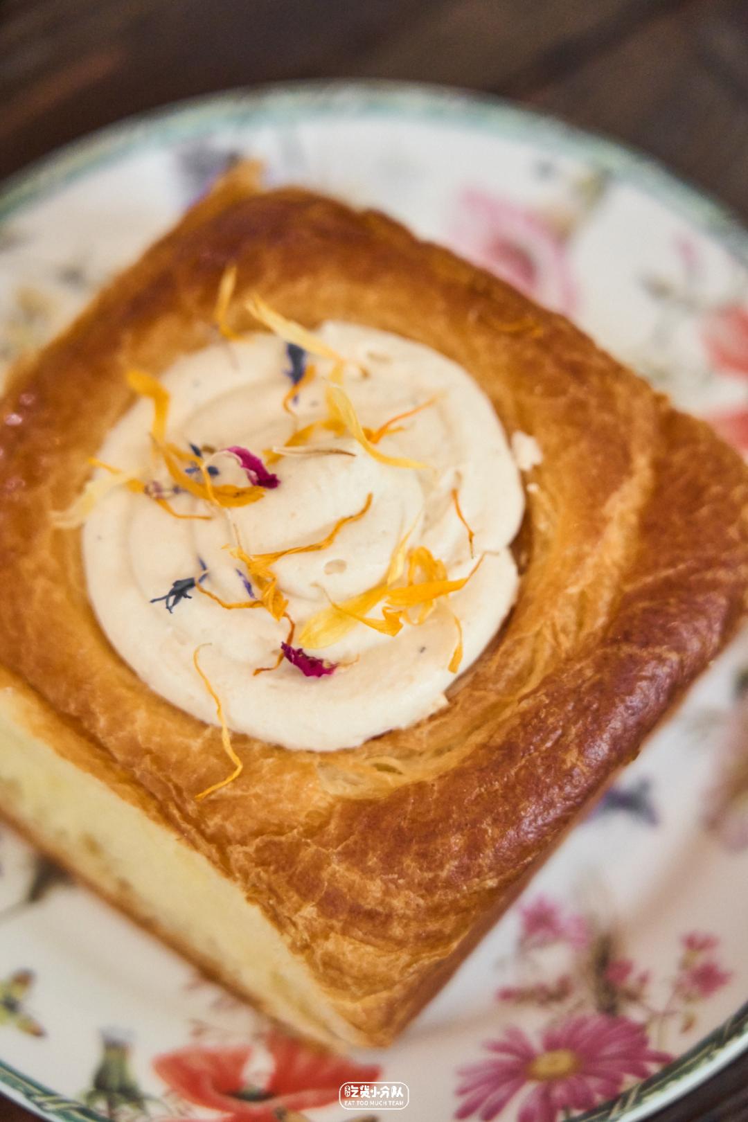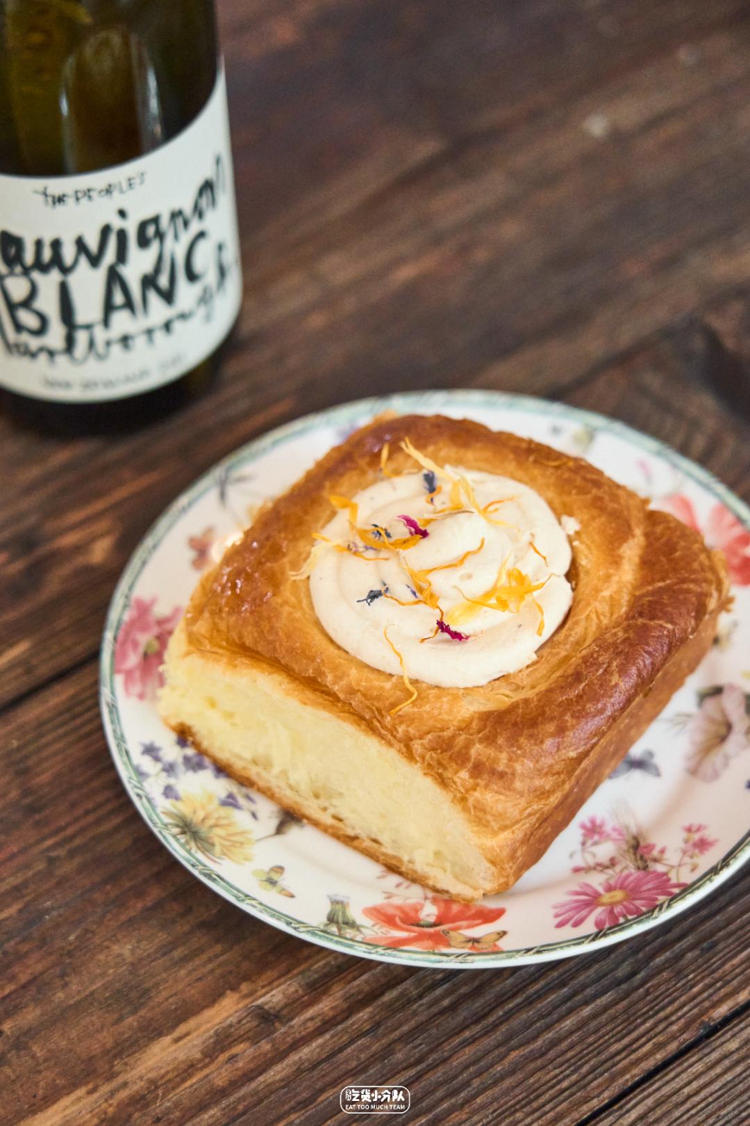 这家白天卖面包、晚上卖预约制Dinner的韩系面包店,算是近期面包新店里最火的1家,连工作日的饭点也是座无虚席。店内的暗调主色系搭配原木色桌椅,无一不显尽高级感。颜值出众的可颂卷无疑是店里的宠儿,枣泥奶油+麻薯的搭配层次丰富,酸甜带点颗粒感让人眼前一亮。Bake No Title(番禺路店)