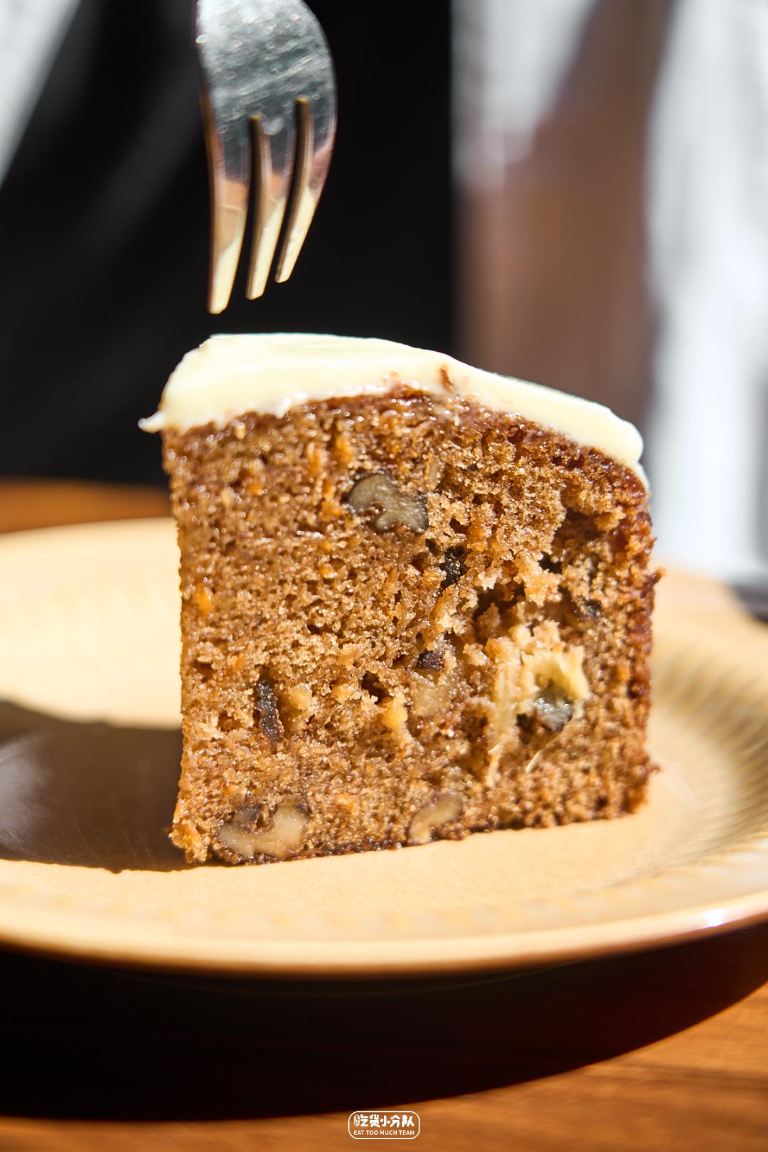如今在上海遍地开花的「BAKER&SPICE」,早已成了甜品人们的日常口粮店。胡萝卜蛋糕是他家必点,本体有类似磅蛋糕的扎实和颗粒感,大块坚果镶嵌在内,是不加掩饰的甜腻浓郁。这款单吃有些甜了,配杯咖啡一起恰才是正解。BAKER&SPICE(幸福里店)