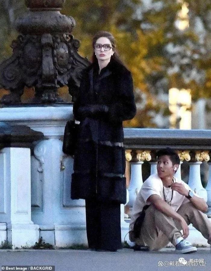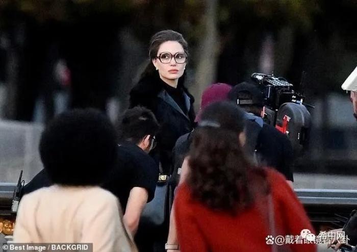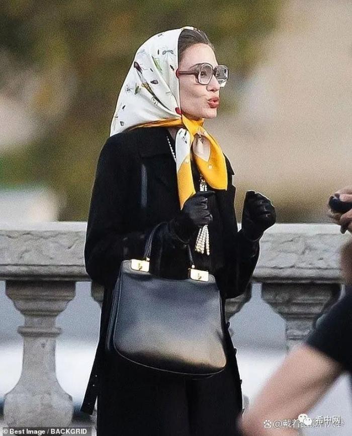 就在前一天,朱莉在片场还穿着演员本人的衣服进行拍摄。戴着厚厚的眼镜,朱莉穿着一件黑色皮草,手拿黑色包包。