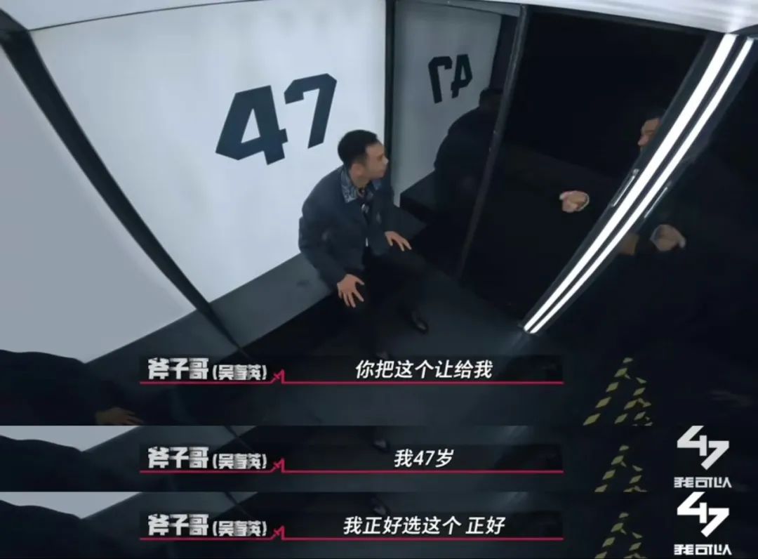 同时,《我可以47》以一种游离的第三方视角,对人的复杂性进行了细致的剖析。登上方舟后,队员们首先面临的选择是,在1—47号房间中找到属于自己的位置。在这个过程中,队员们的个性得到了十分直观的呈现。比如都坚定认为自己是最强者的李景亮和何佩璋,二人同时坐进了1号房间。养猪农民斧子哥则直接将拳王徐灿从47号房间里“赶”了出去,对他说“我不行事儿,今年我正好47岁”。