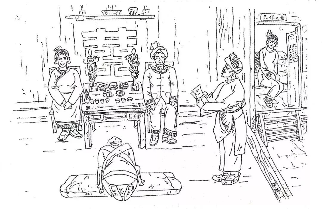 图:邹愿松仡佬族结亲前,请媒人去女方家提亲,得到应允后,再请媒妁正式向女家纳“采择之礼”。先由媒人与女方家议定彩礼数目,男家备礼后,择吉日送到女方家,女方家验收无错,全部收下,将酒肉食品放到祖宗神龛前祭祀,放炮庆贺。男方家再派人到女方家去通知成亲迎娶的日期。在女家迎亲期到,待嫁女要“哭嫁”。出嫁唱的歌叫哭嫁歌。