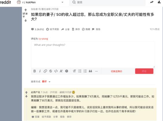 红迪网有个比较热的话题,「如果你的妻子收入比你高,你会当『全职爸爸』吗?」引发了大批网友讨论。