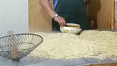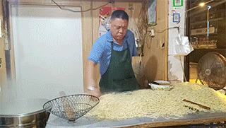 老四也是一家打算传承百年的干派热干面,一进门就看到两个长得极像的男将。六十八岁的老陈烫面,三十七岁的儿子小陈给料。