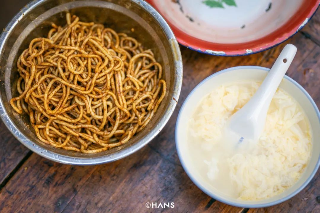 只要工夫深,热干面必成。半夜一点钟起来生炉子烧水,然后开始掸面,烫面更是要亲力亲为。技巧并不难,无非是把生面烫到半熟,再摊开,均匀淋上少许芝麻油,挑起来抖匀,爷爷奶奶辈自己也会在家搞。