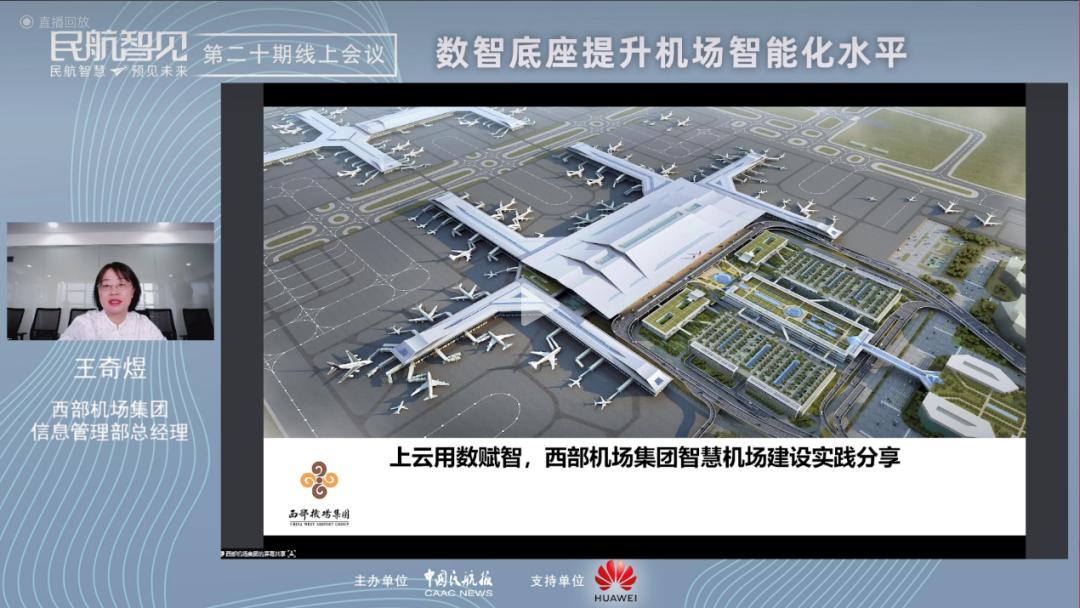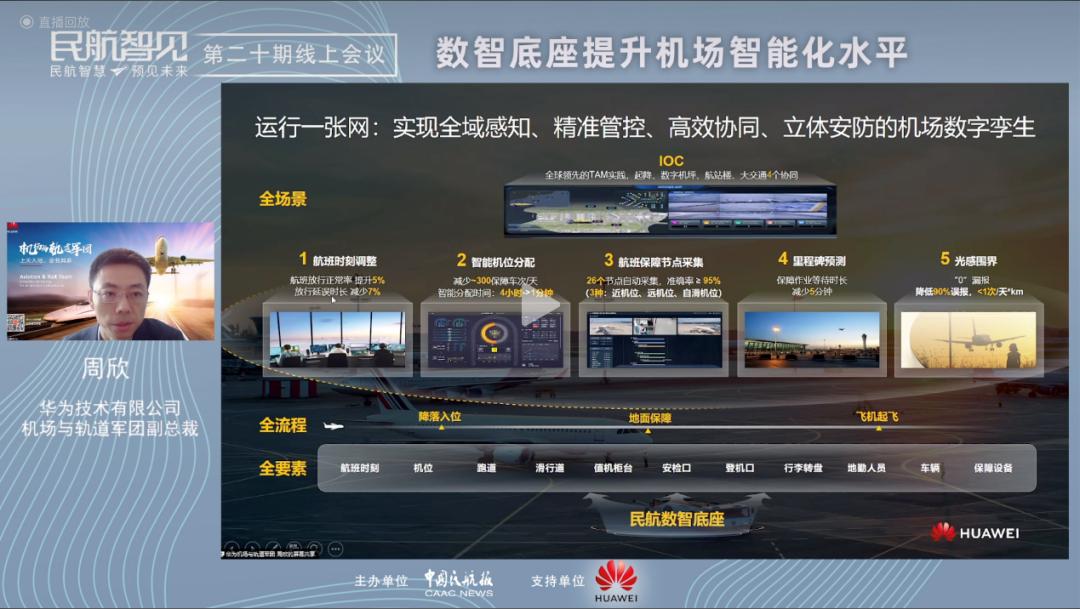 作为本次线上会议的支持方,华为技术有限公司机场与轨道军团副总裁周欣对数智底座如何助力民航业实现智能化升级进行了深刻阐释。周欣表示,行业已进入智能化时代,华为作为全球领先的ICT基础设施供应商,打造了民航数智底座,希望通过多维感知、泛在联接和开放平台,联合伙伴深入业务场景,助力五个一提“智”增效。在智慧运行方面,打造全域感知、精准管控、高效协同的机场数字孪生。如智能机位分配,让过去需几个小时的人工分配,提升至几分钟完成,靠桥率提升也可降低场面车辆的冲突风险。如航班的时刻调整、里程碑预测等场景,通过人工智能模型打造了主动运控,使大面积延误积压的航班能快速恢复,让运控更主动。在安防方面打造机场光感围界方案,实现“0”漏报,极低误报。在监管方面,华为有幸参与民航局智慧监管服务平台建设项目,以技术手段助力民航监管业务实现信息化和数字化。通过为西部机场集团和上海机场集团打造数字底座,并为其提供数字化解决方案,华为数字底座大幅提升了训练和推理算法,可长期支持其智慧化应用,依托全栈自主创新的数智底座,围绕场景智能化在民航各领域持续创新,目前,华为已经在全球130+机场和航司均有实践。