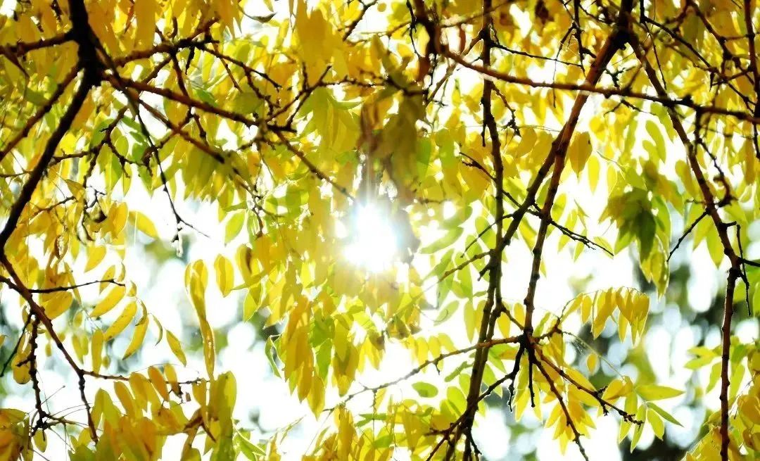 槐树褪去绿色罗裙换上金色秋装