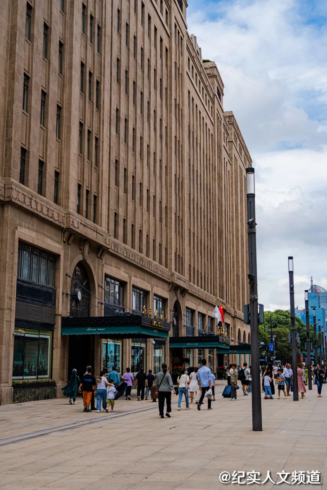 左图拍摄于1973年(摄影师:哈里森·福尔曼),可以看到和平饭店门口的行人和车辆,街道上方有电车架空线;右图拍摄于2023年,和平饭店建筑没有变化,远处多了浦东陆家嘴的高楼。南京路步行街在2020年东拓至外滩,街道上方的电车架空线被拆除,20路电车改走九江路。