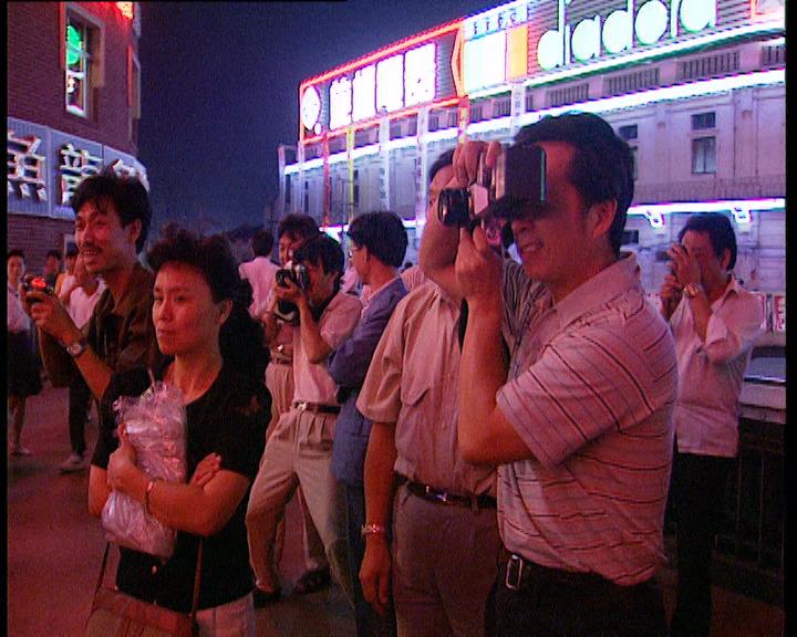 上图拍摄于二十世纪九十年代初(图片来源:上海音像资料馆),画面左侧是第一百货,十字路口的椭圆形天桥上站满了市民游客,这座建于1985年的人行天桥是当年的城市地标;中间图拍摄于二十世纪九十年代初(图片来源:上海音像资料馆),很多市民游客站在在椭圆形天桥上用胶片相机以南京路为背景合影留念;