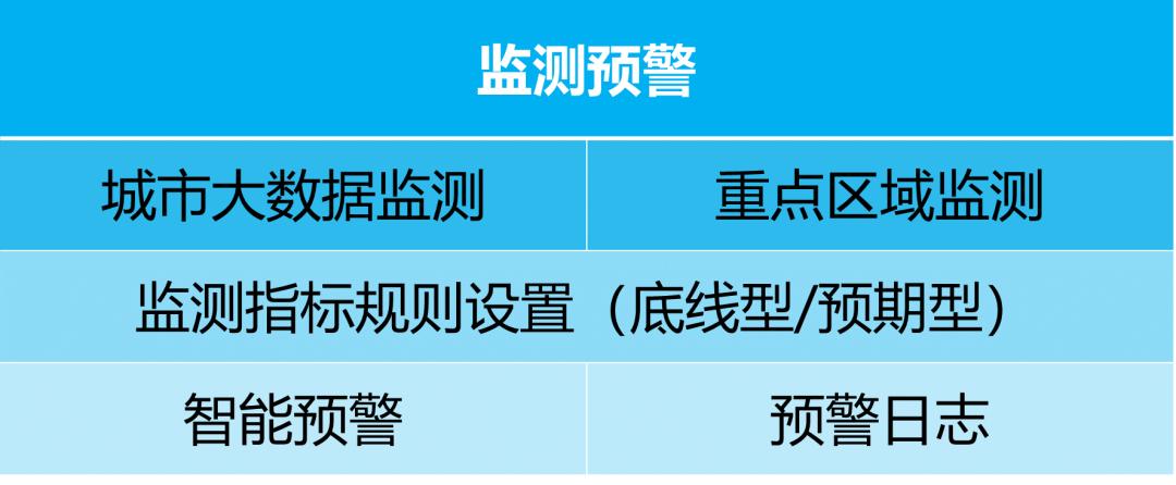 2. 监测预警结合人工智能、大数据、物联网、GIS、遥感等信息化技术,智能监测跟踪城市体征,当超出标准值一定范围时进行预警。